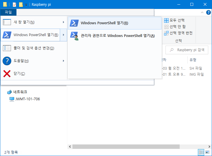 윈도우 탐색기에서 해당 폴더로 이동한 다음 '파일 -> Windows Powershell 열기'를 클릭.