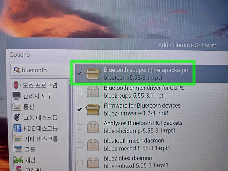 원인을 찾으려고 라즈베리파이OS 에서 bluetooth 를 검색 후 설치된 패키지를 확인해봤습니다. 설치가 안된 패키지가 꽤 보이더군요. 무엇보다 최상단에 있는 Bluetooth support (metapackage)가 기본 미설치 상태였는데 저걸 하나 추가 설치하고 나니 바로 블루투스 검색/페어링 가능해졌습니다.