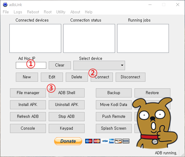 4. PC에서 ADBLink 실행 하여 티보 접속 : Ad Hoc IP 입력란에 자신의 무선 공유기 상에 연결된 티보의 로컬 네트워크 IP (192.168 로 시작하는 주소) 입력하여 Connect 누르기 (처음 접속시엔 PC 화면에서는 연결 실패로 뜸)