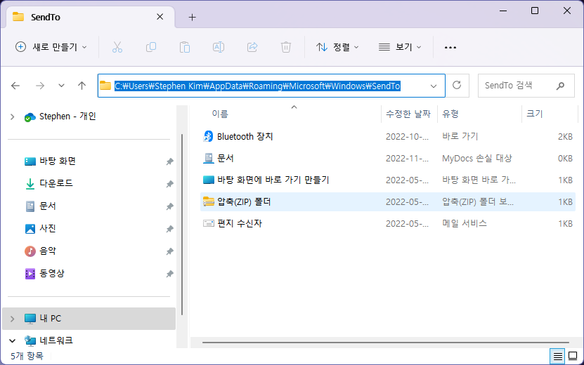 탐색기 상단의 '보기>표시>숨긴 항목'를 활성화하면 AppData 라는 숨겨진 폴더에 접근이 가능한데 C:\Users\유저이름\AppData\Roaming\Microsoft\Windows\SendTo 폴더에 있는 '압축(ZIP) 폴더' 라는 파일을 삭제 합니다. (또는 경로상의 빨간색 '유저이름' 부분을 자신의 계정 이름으로 바꿔서 탐색기에서 바로 복붙하시고 이동하시면 숨긴 항목 표시하는건 생략해도 됩니다)