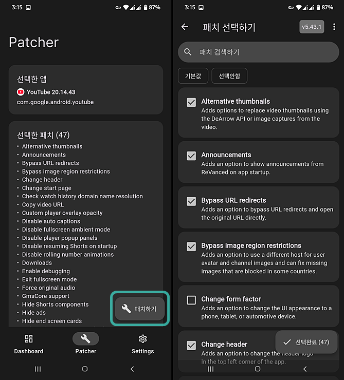 하단의 'Patch (패치하기)' 를 선택하면 APK 빌드 작업이 바로 시작됩니다.