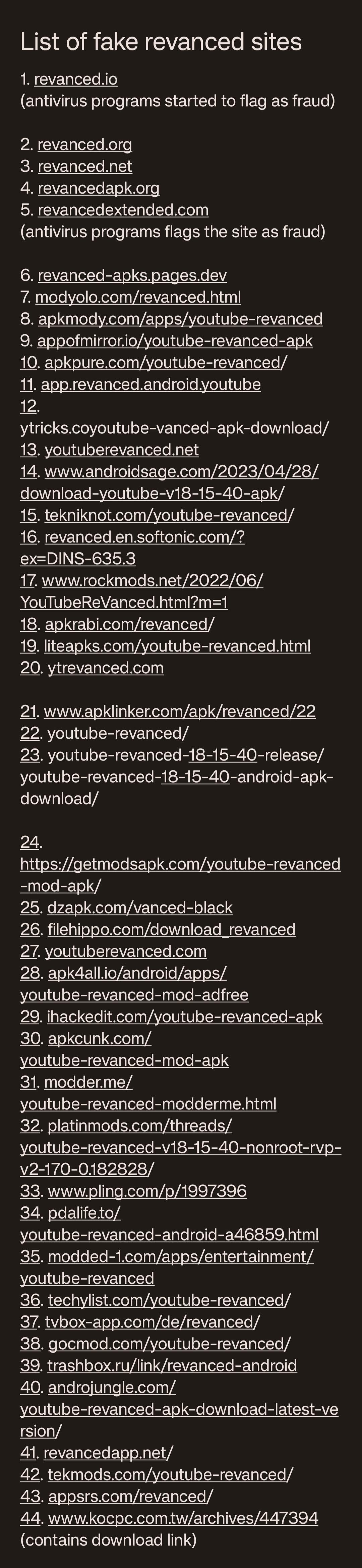 다음 리스트는 Reddit ReVanced 커뮤니티에 올라온 'ReVanced 가짜 Fake 웹사이트' 목록입니다. 리스트에서 젤 처음 보이는 revanced.io 가 마치 공식 사이트인 것처럼 개발진들 소개하고, 그럴듯하게 사이트를 꾸며놔서 국내서도 나름 유명했었습니다.