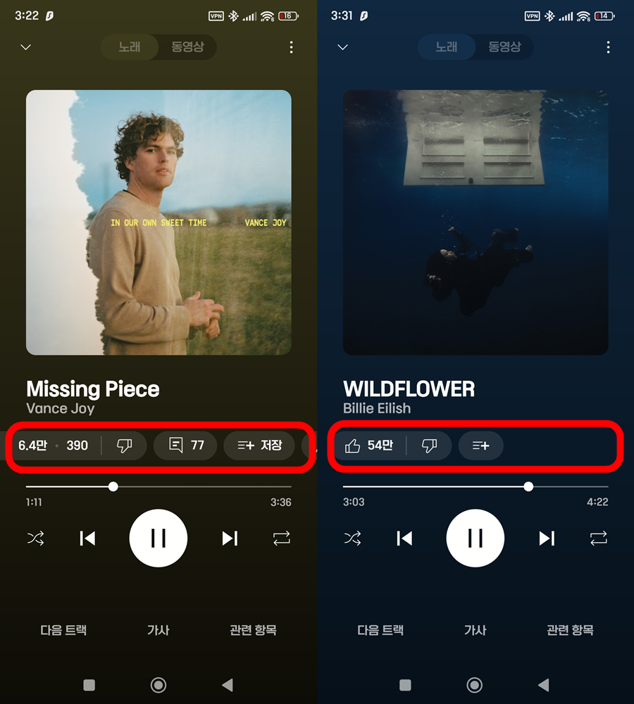※ 뮤비 재생은 거르고 음원만 재생하기 위한 한가지 꿀팁 : '아티스트 페이지'에서 '인기곡' 항목을 재생시 뮤직 비디오가 아닌 음원만 재생됩니다. 아티스트 페이지 내에서 '앨범' 쪽 음원은 뮤직 비디오가 있으면 뮤직 비디오를 우선으로 재생하는데 '인기곡' 메뉴는 특이하게 음원만 재생합니다. 이렇게 '인기곡'으로 재생해서 '좋아요 표시한 음악', '플레이리스트' 을 구성한다면 해당 플레이리스트는 뮤비 재생 없이 음원만 재생이 가능합니다.