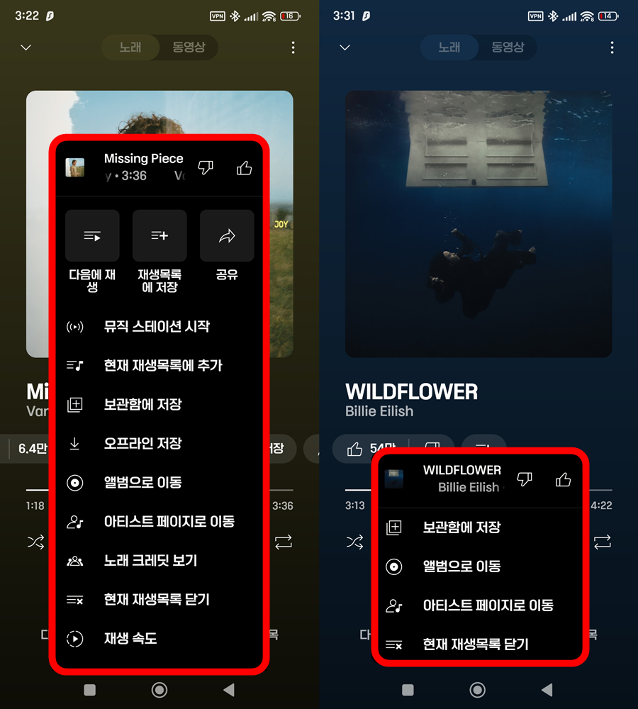 RVX Youtube Music 의 화면 UI 커스텀 전후 비교