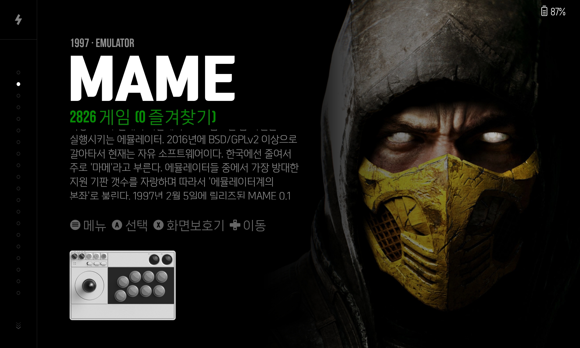 복사가 끝난 후 ES-DE 를 실행해보면 한방팩에 있던 아케이드, MAME, NEOGEO 롬 파일들이 보입니다. (만약 ES-DE 실행시 '게임 파일을 찾을 수 없습니다' 라고 메뉴가 뜨면 앱 종료하고 재실행하면 OK)